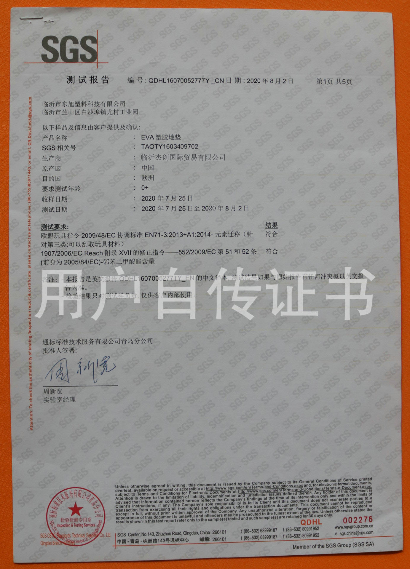 · Requirements: You must ensure that the materials used in the mat (such as PVC, EVA, rubber, surface coatings, printing inks, etc.) do not contain substances of very high concern (SVHCs) restricted in Annex XVII of the REACH Regulation. Chemical testing of the product by a third-party testing laboratory is typically required, and a REACH compliance test report is issued. 2. EN 71-3 Safety of Toys – Part 3: Migration of Certain Elements